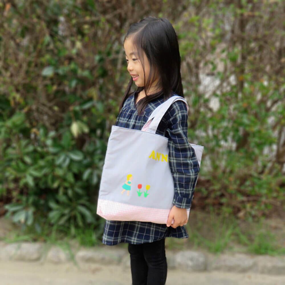 アップリケをつけることを目的とした、生地や色にもこだわったシンプルな「レッスンバッグ」、「お着替え袋」、「シューズ袋」の3点セットです。